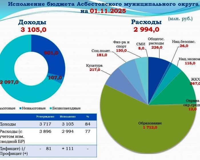 По состоянию на 1 ноября 2025 года в бюджет Асбестовского муниципального округа поступило 3 105 млн рублей, что составляет 84% годового плана (при плане на 2025 год — 3 717 млн рублей).