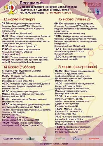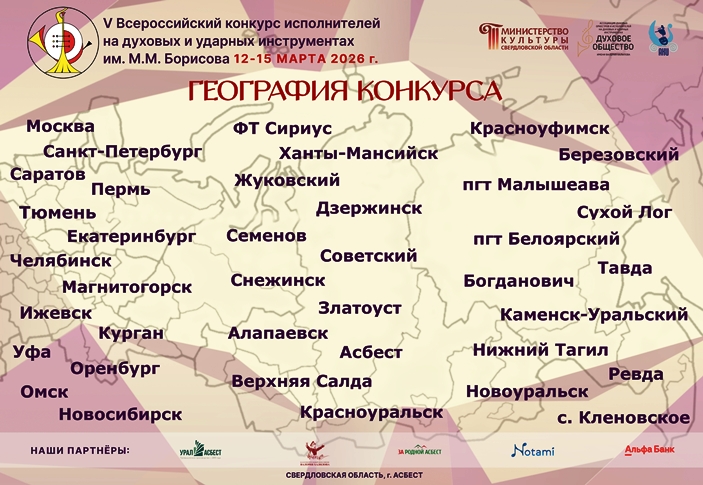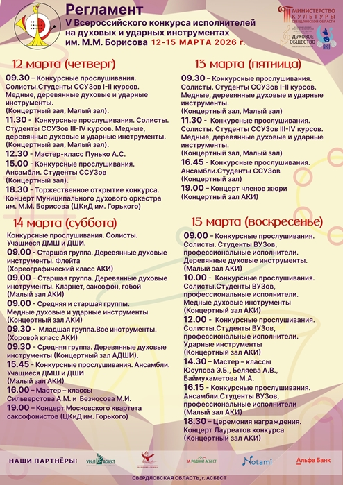 | Торжественное открытие состоится в Центре культуры и досуга им.Горького в 18.30 концертом муниципального духового оркестра им.М.М.Борисова. Конкурс продлится четыре дня - до 15 марта. 12-13 марта идет прослушивание участников - студентов средних специальных учебных заведений, исполнителей и ансамблей. 14 марта перед жюри представляют свои выступления учащиеся детских музыкальных школ, 15 марта выступят студенты высших учебных заведений и студенческие ансамбли. В перерывах пройдут мастер-классы именитых педагогов. Концерт членов жюри состоится в концертном зале Асбестовского колледжа искусств 13 марта в 19.00 (вход свободный). 14 марта в Центре культуры и досуга в 19.00 выступит Московский квартет саксофонистов, закрытие фестиваля, награждение и концерт лауреатов конкурса - 15 марта в 18.30 в концертном зале АКИ. В жюри конкурса – ведущие преподаватели из разных высших и средних профессиональных образовательных учреждений искусства и культуры (Екатеринбурга, Москвы, Санкт-Петербурга, Казани, Саратова, Челябинска, Магнитогорска), профессиональные музыканты России. Конкурс каждый раз становится стартовой площадкой для молодых музыкантов. В истории конкурса есть такие имена, как обладатели Гран-при конкурсов 2020 и 2018 гг. – Михаил Казаков (лауреат Международного конкурса им. Адольфа Сакса) и Иван Пятков (финалист 6-го сезона Всероссийского телевизионного конкурса талантов «Синяя птица»). С 2004 года (раз в два года) в Асбесте проходит Всероссийский конкурс исполнителей на духовых и ударных инструментах имени М.М. Борисова. Уральский город становится центром оркестровой музыки, гостеприимно принимая у себя музыкантов разного возраста — от самых юных до опытнейших мастеров-профессионалов. Музыканты с теплотой называют его — «Борисовский». Заслуженный работник культуры России, почётный гражданин Асбеста Михаил Михайлович Борисов многие годы руководил городским духовым оркестром и внес большой вклад в развитие музыкального искусства. Источник | |