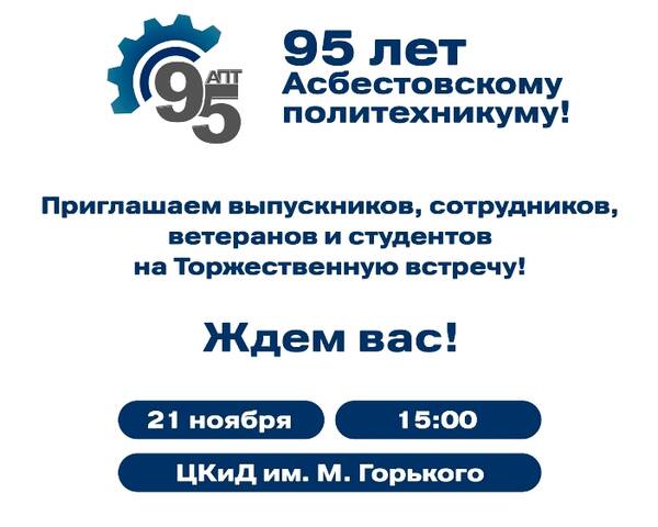 | Торжество состоится 21 ноября 2025 года в 15:00 в Центре культуры и досуга. В 1930 году, по приказу Высшего Совета Народного хозяйства СССР, в Асбесте был открыт техникум, который начал готовить специалистов для горнодобывающей отрасли региона. Еще не было своего здания, всего 30 студентов и преподаватели — работники городских предприятий. Сегодня техникум — один из крупнейших в области. Он готовит специалистов по 16 профессиям и специальностям, в том числе по в рамках федеральной программы «Профессионалитет». Асбестовский политехникум приглашает всех на торжественную встречу 21 ноября 2025 года в 15:00 в Центре культуры и досуга. Асбестовский политехникум | |