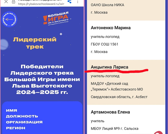 | Лариса Анатольевна Анцыгина, учитель-логопед детского сада «Теремок», стала победителем лидерского трека Большой игры имени Льва Выготского. Конкурс им. Л.С. Выготского, посвящен творчеству и исследованиям в области психологии и педагогики, основанный на работах Выготского, которые акцентируют внимание на развитии и обучении в контексте культурно-исторического подхода. Конкурсные испытания Большой игры отличаются высокой степенью сложности и требуют от участников не только теоретических знаний, но и практических навыков. Каждое задание разработано с учетом реальных сценариев и вызовов, с которыми могут столкнуться современные лидеры. Участники должны продемонстрировать критическое мышление, умение работать в команде, а также креативный подход к решению проблем. Приз для 100 финалистов – самых ярких, самобытных, драйвовых участников лидерского трека – участие в Летней школе 2025. Она пройдет в Москве с 18 по 22 июня. Летняя школа — это образовательная инициатива, направленная на развитие педагогических и психологических навыков, а также на обмен опытом между участниками, которые стремятся улучшить качество образования. "Эта победа стала возможна благодаря огромному труду и стремлению к развитию. С 2019 года я принимала участие в этом конкурсе. Я ценю поддержку, которую получаем я и каждый педагог в нашей профессиональной среде. Надеюсь, что мои знания и опыт и в дальнейшем будут востребованы в городе, а моя победа вдохновит педагогов на новые достижения" - комментирует Л.А.Анцыгина. С. Богданова, начальник управления образованием | |