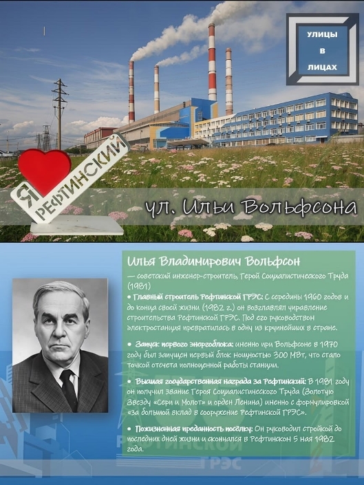 | 3 марта в поселке развернулась необычная акция - педагоги «Центра молодёжи» вышли к людям, чтобы рассказать о человеке, чьё имя носит местная улица. Илья Вольфсон был главным строителем Рефтинской ГРЭС с середины 1960-х годов и руководил стройкой вплоть до 1982 года. Именно под его началом в 1970 году был введен в эксплуатацию первый энергоблок станции мощностью 300 МВт, что стало важнейшим событием для развития энергетики всего региона. За выдающиеся трудовые успехи в 1981 году ему было присвоено звание Героя Социалистического Труда. Илья Владимирович скончался в Рефтинском 5 мая 1982 года. Организаторы акции Елена Евлентьева и Вера Панченко подготовили наглядные макеты с историей строителя и 3 марта раздали их прохожим, рабочим и жителям. чтобы как можно больше людей узнало о заслугах и судьбе человека, в честь которого названа улица. Источник | |