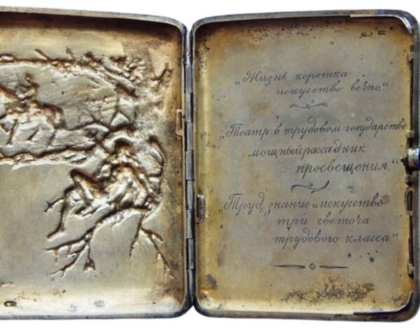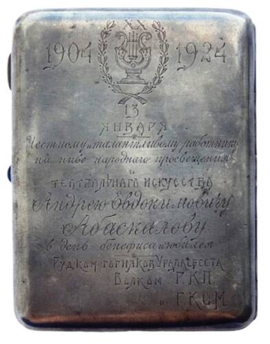 | Этот антиквариат из прошлого когда-то принадлежал Андрею Евдокимовичу Абаскалову - актёру и режиссёру первого драматического кружка на Асбестовых приисках. На портсигаре несколько надписей-гравировок, в том числе и дата - 13 января 1924 год. В тот зимний день на Асбестовых рудниках отмечали двадцатилетний юбилей театральной деятельности А.Е.Абаскалова. Портсигар был подарен Андрею Евдокимовичу Рудничным комитетом горняков треста "Ураласбест" и Волостным комитетом РКП(б) и РКСМ. На задней крышке портсигара надпись-гравировка: «Честному и талантливому работнику на ниве народного просвещения и театрального искусства Андрею Евдокимовичу Абаскалову в день бенефиса и юбилея». С внутренней стороны выгравировано несколько цитат: "Жизнь коротка, искусство вечно", "Театр в трудовом государстве мощный рассадник посвящения", "Труд, знание и искусство - три светоча трудового класса". Театральные именины Абаскалова справляли в переполненном зале театра «Пролетновь». На украшенной в честь праздника сцене театра был поставлен спектакль, с участием А.Е.Абаскалова в главной роли. Как только он появлялся на сцене, зал дружно аплодировал. Играл духовой оркестр. Андрей Евдокимович был прекрасным актером и режиссером, за двадцать лет сыграл более 250 ролей, поставил около 30 спектаклей, с гордостью носил звание «народного актера», присвоенное ему благодарными зрителями приисков. Среди многочисленных поздравлений и подарков Андрею Евдокимовичу Абаскалову был вручён и этот серебряный портсигар «Лесная дева». В начале XX века, практически все представители знати имели по изысканному портсигару в кармане. Эти изделия, особенно из серебра и золота, пользовались популярностью не только среди курильщиков, но и среди тех, кто даже не притрагивался к сигаретам. Портсигары стали популярными у отдельных представителей творческих профессий. Носить портсигар в кармане стало модно. К середине 20-х портсигар приобретает особый статус, его используют в качестве награды. Такие подарки дарили чекистам, военным, чиновникам, иногда отличившимся рабочим и колхозникам. При этом вместе с подарком человек получал и документ о его вручении. Вот и Андрей Евдокимович получил такой подарок. На портсигаре подаренному А.Е Абаскалову стоит клеймо «Монь» и «84». «84» — это историческая проба серебра, использовавшаяся в Российской Империи. Она указывает на содержание чистого серебра в сплаве по золотниковой системе: 84 золотника из 96 — это примерно 87,5% чистого серебра в изделии. Остальные 12 золотников (12,5%) — это примеси, чаще всего медь. Проба 84 применялась с XVIII века до начала XX века, до перехода на метрическую систему в СССР и чаще всего встречалась на столовых приборах, посуде, украшениях, церковной утвари и предметах быта. На изделиях обязательно присутствовало клеймо пробы «84» и как правило клеймо мастера. По золотниковой системе, старинная 84 проба примерно соответствует современной 875 пробе чистого серебра. Такие изделия высоко ценятся коллекционерами и антикварами, особенно если сохранились клейма и оригинальный внешний вид. А клеймо «Монь» означает название мастерской или фамилию мастера, например, Моносзона — купца, владельца мастерской по изготовлению золотых и серебряных изделий с эмалью и драгоценными камнями. Серебряный портсигар «Лесная дева», клеймо «Мо